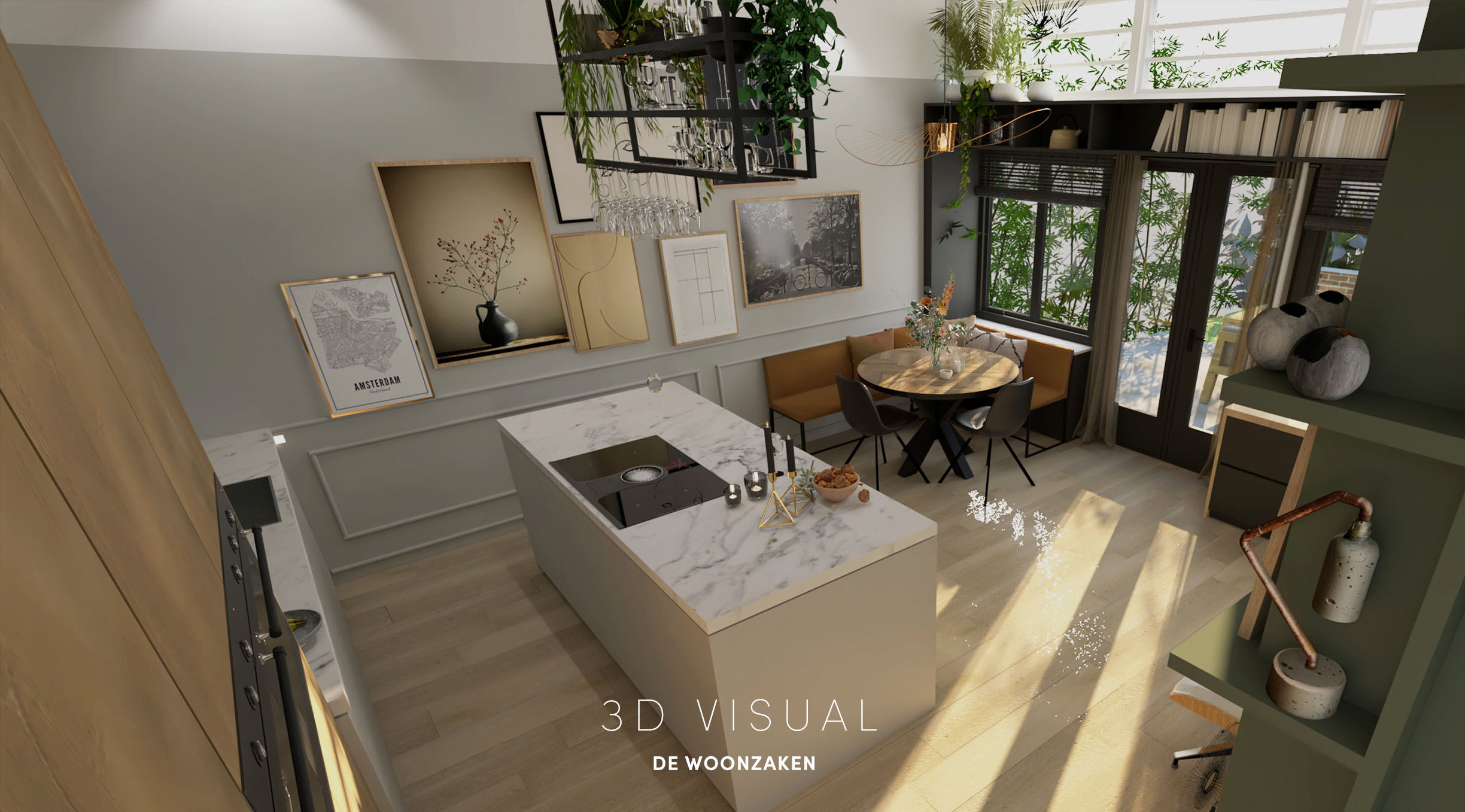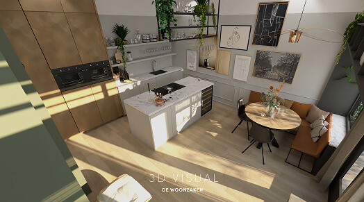 Van vloerkeuze tot raambekleding, van de kleur op de wand tot aan het meubilair. Alles kan worden uitgewerkt, desgewenst volledig in 3D.
