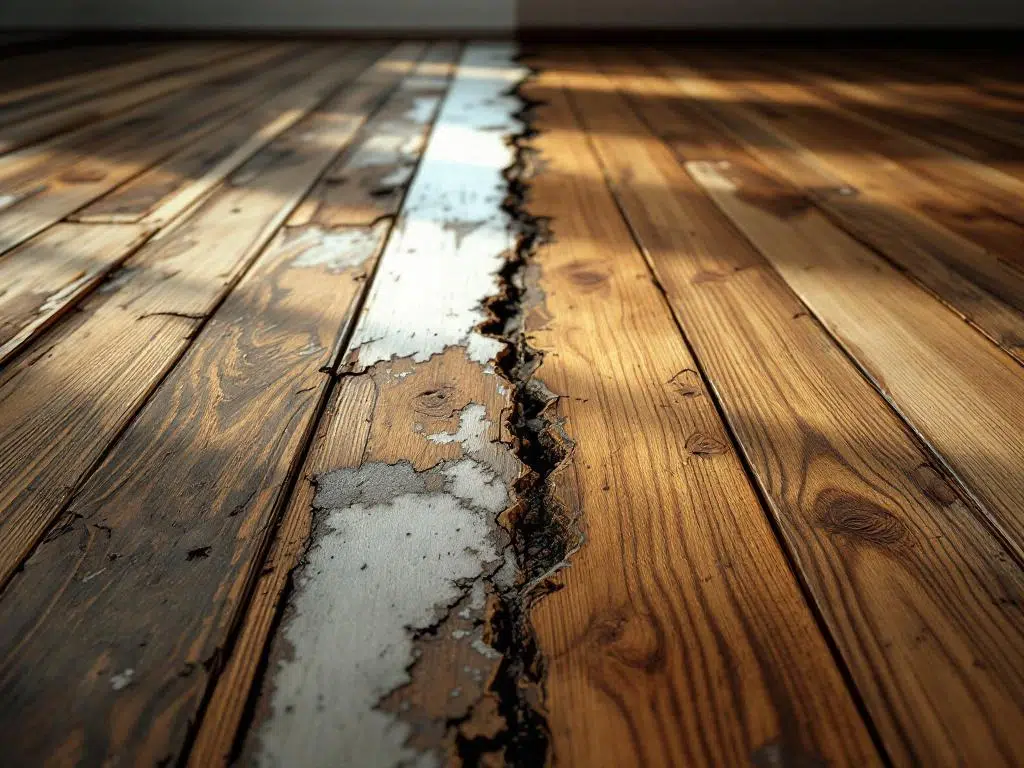 Diepe beschadigingen laten de onderliggende materialen bloot. Bij laminaat zie je dan het donkere MDF-board eronder, bij PVC vloeren wordt de structuur zichtbaar. Deze plekken zijn niet alleen lelijk, ze trekken ook vocht aan. Dat vocht kan zich verspreiden naar andere delen van je vloer en zorgen voor nog meer problemen.